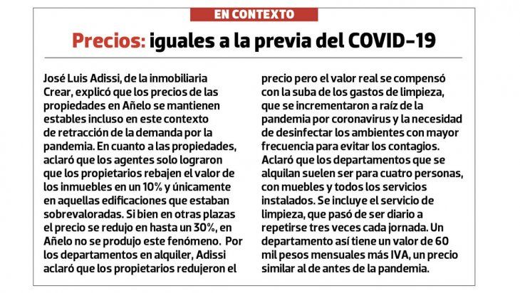 Si bien la actividad es casi nula en la compra y venta y muy reducida en el rubro de alquileres, Adissi aclaró que los precios se mantienen estables y que no han tenido reducciones (ver aparte). A su vez, indicó que esperan una recuperación paulatina hacia fin de año.
