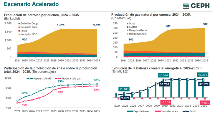 Finalmente, el Escenario Acelerado anticipa un boom perforador inmediato. Contempla una aceleración sensible en la cantidad de pozos enganchados de shale oil hasta 2030, para luego estabilizar la producción de crudo. Los resultados productivos de largo plazo resultan similares al modelo expansivo, con 1.671 kbbl/d de crudo y 302 MMm3/d de gas , y un superávit comercial de 37.271 millones de dólares.