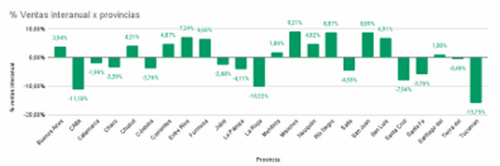 A nivel provincial, el panorama fue mixto, pero con signos positivos en varias regiones. De las 24 provincias relevadas, doce experimentaron índices interanuales positivos. Misiones lideró la recuperación con un impresionante crecimiento del 9,21%, seguida de cerca por San Juan y Río Negro, con aumentos del 8,89 y 8,87% respectivamente. Entre las provincias que mostraron un retroceso, Tucumán destacó negativamente por cuarto mes consecutivo con una caída del -15,75%, y la Ciudad Autónoma de Buenos Aires (CABA) registró una baja del -11,18%.