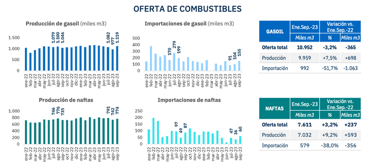 Los datos muestran en los primeros nueve meses del año se produjeron 9.959.000 m3 de gasoil, y se importaron 992 mil m3 (-55,7% vs el mismo periodo de 2022). Mientras que la producción local de naftas ascendió a 7.032.000 m3, con una importación de 579.000 m3 (-38%).
