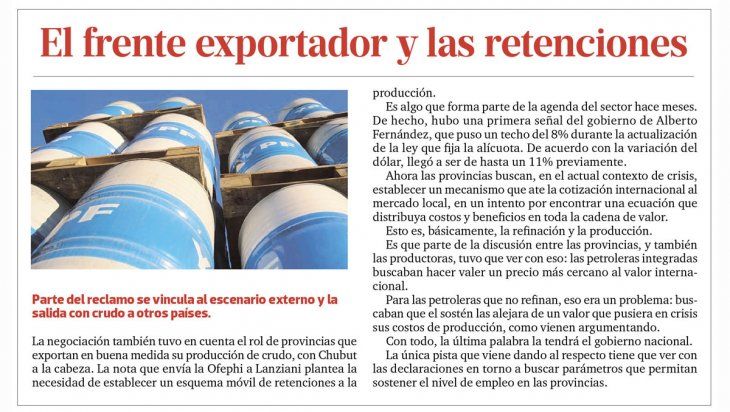 Los gobernadores petroleros zanjaron diferencias sobre el precio para apuntalar la industria y las economías provinciales. Le enviaron a Lanziani una cifra y el pedido de bajar retenciones y poder exportar petróleo cuando haya excedentes en el país.