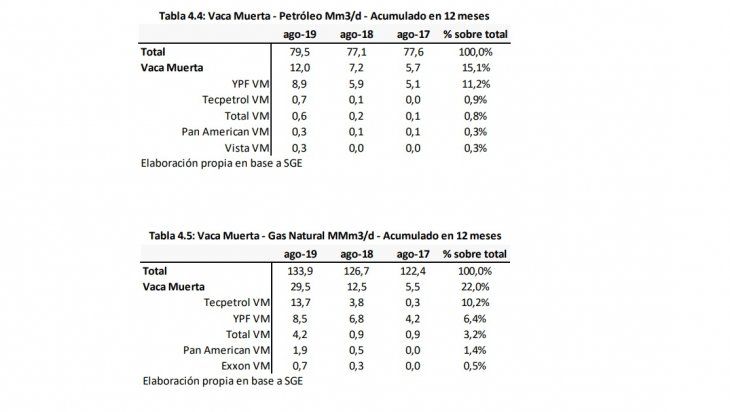 "La producción de petróleo no convencional en la formación Vaca Muerta, en la Cuenca Neuquina, representa actualmente el 15,1% del total producido en el país", apunta el informe. "En la formación Vaca Muerta Tecpetrol aumenta su producción anual 262%, YPF 25,2% y Total 472%", añade el documento.
