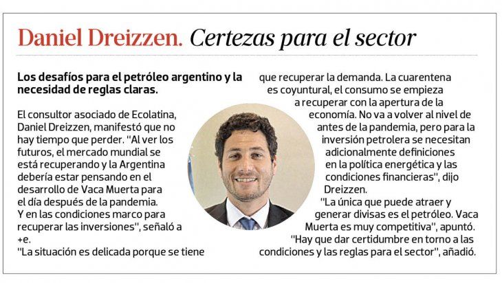 Daniel Dreizzen, consultor asociado de Ecolatina, subrayó: “La posibilidad de que esto crezca es real, en petróleo se puede hacer mucho más con mecanismos financieros y que pase la coyuntura del coronavirus”. En el caso del gas, las dificultades son distintas: hay un contexto de bajos precios previo a la pandemia, hace falta infraestructura y la consolidación de mercados (internos con gasoductos y externos con el GNL).