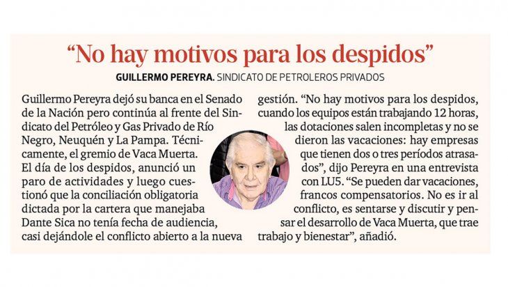 Mientras se espera que las nuevas autoridades se asienten en sus funciones asignadas por el presidente Alberto Fernández, el secretario general de los petroleros privados, Guillermo Pereyra, planteó prorrogar la convocatoria del 12 de diciembre. Claudio Moroni asumió en el Ministerio de Trabajo de la Nación y estará a cargo de gestionar el conflicto en Vaca Muerta, en una asamblea que será a mediados de la semana que viene.