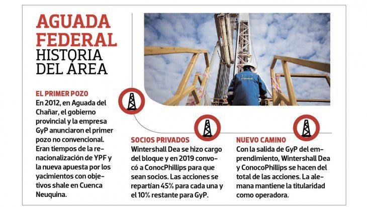 Aguada Federal fue una de las primeras áreas en explorar hidrocarburos no convencionales en el furor de Vaca Muerta y que despertó el interés de operadoras de primer nivel. Gas y Petróleo de Neuquén (GyP) invirtió en los primeros pozos, en un sistema de “carry limitado”, que con el paso del tiempo le generó una deuda que en la actualidad no le resultaba conveniente y optó por la venta a los socios privados Wintershall Dea y ConoccoPhillips.