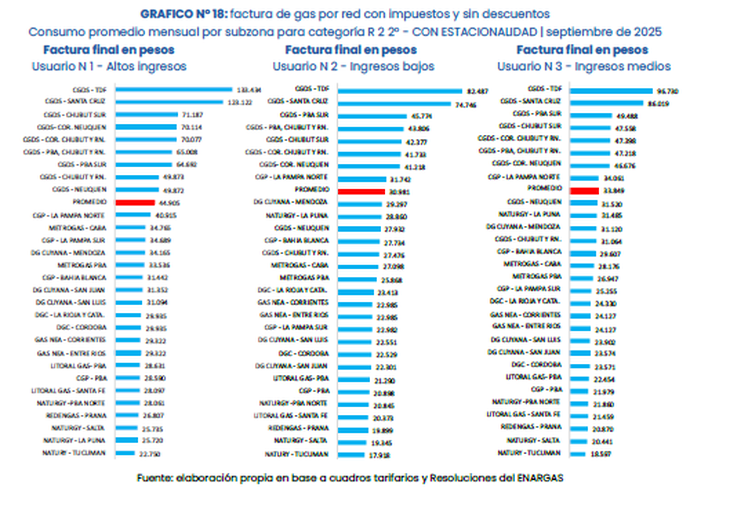 La estructura de tarifas de servicios públicos en Argentina presenta una notable dispersión. En septiembre de 2025, la factura eléctrica promedio a nivel nacional para un hogar de altos ingresos (N1) es de $66.349, mientras que para ingresos bajos (N2) es de $40.524 y para ingresos medios (N3) de $47.162. En el caso del gas, los promedios nacionales son de $44.905 (N1), $30.981 (N2) y $33.849 (N3). Sin embargo, estos valores ocultan -según el "Reporte de Tarifas y Subsidios #30", correspondiente a septiembre de 2025, elaborado por el Observatorio de Tarifas y Subsidios del IIEP (UBA-CONICET)- las profundas diferencias que existen entre las distintas jurisdicciones del país.