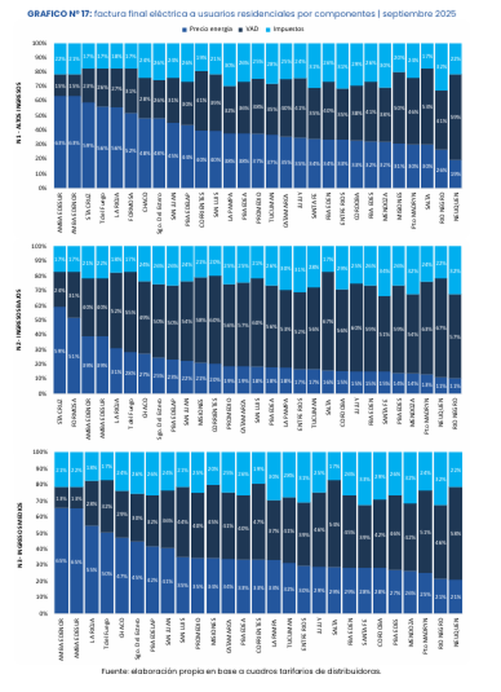 Un componente clave en esta ecuación es el Valor Agregado de Distribución (VAD), cuyo ritmo de incremento varía significativamente entre provincias. Este cargo puede llegar a representar hasta el 56% de la factura final para un usuario de bajos ingresos a nivel nacional (N2), explicando gran parte de las diferencias que pagan los consumidores en cada región.