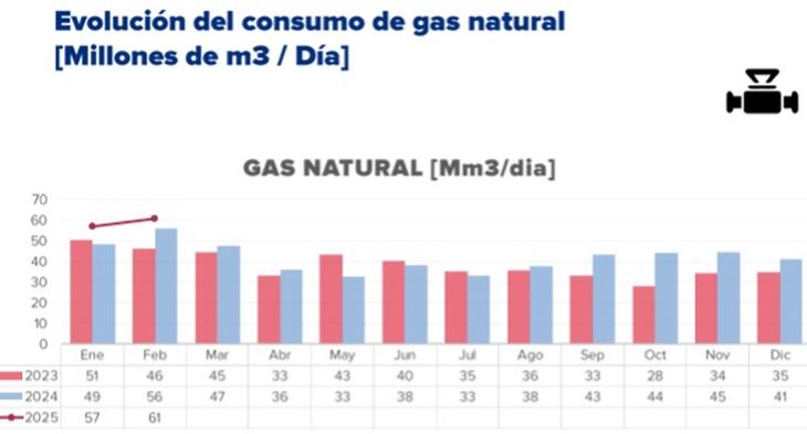 El crecimiento de la generación térmica estuvo acompañado por un mayor consumo de gas natural. En febrero de 2025, la demanda alcanzó 61 millones de m³ diarios, lo que representa un aumento respecto a los 56 millones de m³ diarios de 2024 y los 49 millones de m³ diarios de 2023.