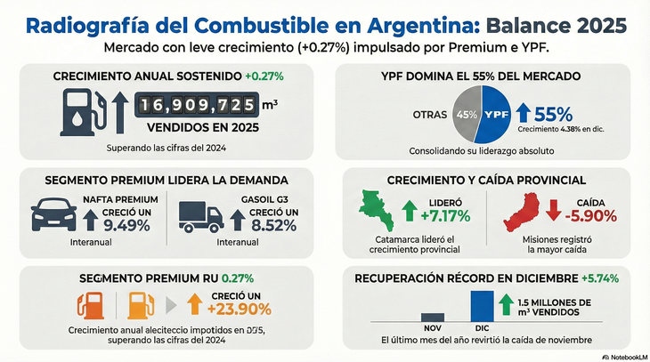 Un dato clave para el sector especializado reside en la composición del consumo. Durante diciembre de 2025, se produjo un marcado contraste entre productos. La nafta premium creció un 9,49% interanual, mientras que el gasoil Grado 3 aumentó un 8,52%. En total, las naftas subieron un 3,81% en diciembre respecto al año anterior.
