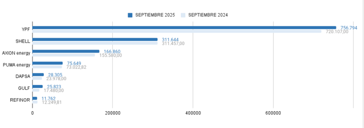 Seis de siete empresas reportan crecimientos interanuales. Gulf Oil destaca con 47,73%, seguido por DAPSA (18,05%). YPF lidera el mercado con 756.794 m³ (5,09% de aumento), Shell con 311.644 m³ (0,06%), Axion Energy con 166.860 m³ (7,25%) y Puma Energy con 75.649 m³ (3,60%). Refinor cae -3,98% con 11.762 m³.