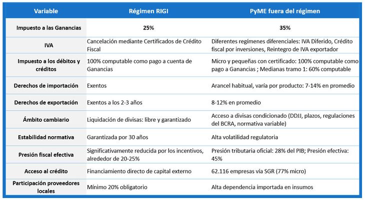 Ventajas clave incluyen reducción del impuesto a las ganancias del 35% al 25%, exención gradual de derechos de exportación, eliminación de aranceles en bienes de capital y libertad en divisas. Estos incentivos generan multiplicadores en cadenas de valor energéticas y mineras.