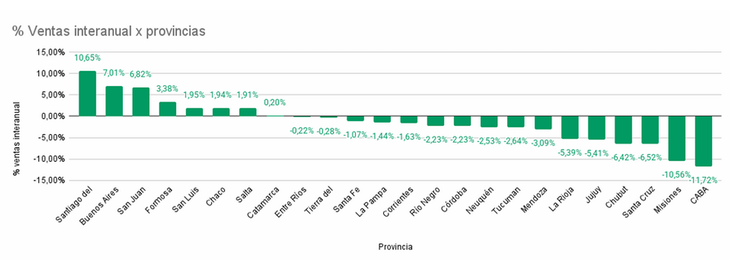 La heterogeneidad también se observa a nivel geográfico. De las 24 provincias, solo 8 mostraron índices interanuales positivos. Santiago del Estero lideró la recuperación con un notable crecimiento del 10,65%, seguida de cerca por Buenos Aires (+7,01%) y San Juan (+6,82%).