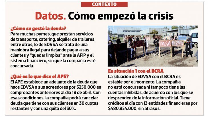 No obstante, desde la empresa ya les han comunicado que no es posible llevar a cabo la operatoria, que entra en el paquete de deudas del Acuerdo Preventivo Extrajudicial (APE) que muchas empresas neuquinas están firmando para poder cobrar algo de las deudas. La empresa había difundido entre sus clientes que el APE tenía una aceptación del 36% de los acreedores, para cobrar en 30 cuotas y una quita del 20% de la deuda. Pero muchos se resistieron a ese esquema y prefieren esperar e iniciar acciones legales.
