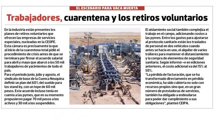 Cada día es un desafío para la industria hidrocarburífera, que se va encontrando con diferentes acciones de sus protagonistas. Ahora, las pymes que ya no quieren absorber al personal en stand by, aquellos trabajadores suspendidos por la baja de actividad, abren un frente que se suma a los cambios que propuso YPF como acuerdo de productividad con los gremios de todas las cuencas en el contexto del COVID-19 (ver págs. 8-9).