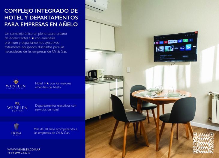 El Wenelen Executive Hotel, inaugurado en 2019, mantiene desde entonces altos niveles de ocupación y fidelización por parte de las principales operadoras y empresas proveedoras de servicios. Con la incorporación de Wenelen Suites, un complejo de 28 departamentos premium de dos ambientes, se amplía la oferta para cubrir la creciente demanda de estadías prolongadas, con la ventaja de estar administrados bajo el mismo esquema operativo del hotel.
