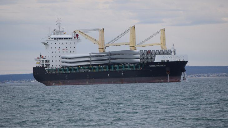 El barco mercante desembarcó en San Antonio Este las primeras 51 aspas para los aerogeneradores del proyecto de renovables más importante de la provincia. Aportará 100,5 MW a partir del primer trimestre del 2020.
