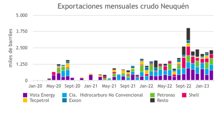 Las empresas que registraron los mayores envíos fueron Vista Energy (33%), Petronas (20%), Compañía de Hidrocarburo No Convencional (20%) y Shell Argentina (11%).