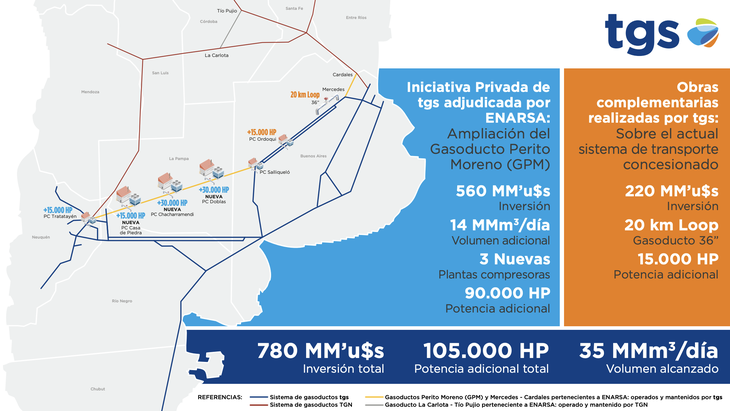 Cabe recordar que el Gasoducto Mercedes-Cardales, ejecutado por ENARSA y actualmente operado y mantenido por tgs, permite que los flujos de gas del sistema de tgs se direccionen hacia el sistema regulado de transporte que abastece el norte del país.