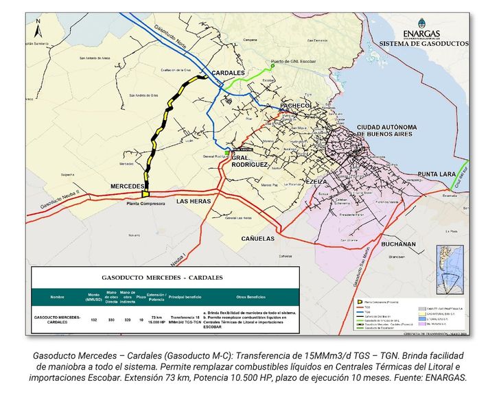 - Se contaría con un canal adicional de alimentación de gas natural, que formaría parte del Anillo Gran Buenos Aires (GBA), que reforzaría el abastecimiento del gran consumo residencial y de generación eléctrica que se registra en dicha zona de entrega.