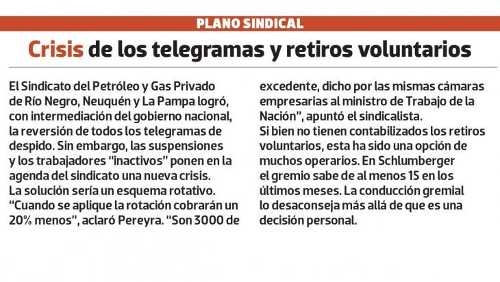 La solución podría ser en un sistema de rotación: una semana suspensión, otra de trabajo. Es lo que está analizando el sector, en el diálogo entre los gremios y las cámaras. Así lo confirmó esta semana Guillermo Pereyra, secretario general del Sindicato del Petróleo y Gas Privado de Río Negro, Neuquén y La Pampa, en conferencia de prensa.