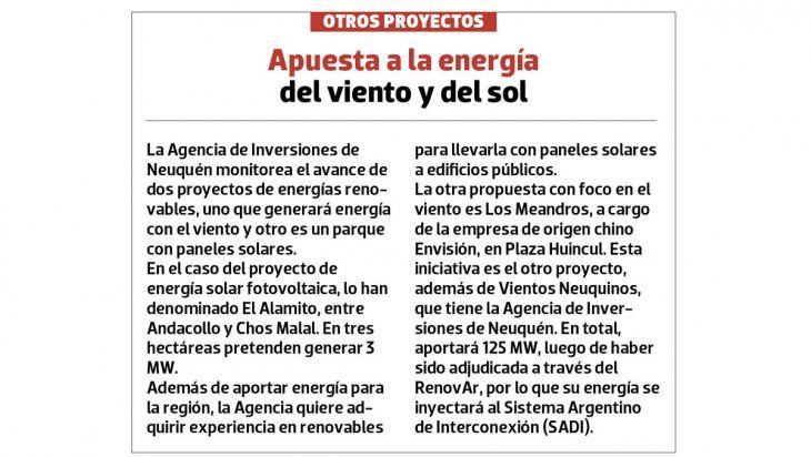 La piedra fundamental del proyecto Vientos Neuquinos la colocaron los trabajadores y el gobernador Omar Gutiérrez en junio. El parque tiene 29 turbinas de 120 metros de altura de buje, 132 metros de diámetro de rotor y 3,465 megavatios de potencia nominal. Este proyecto está dentro del programa de Mercado a Término de las Energías Renovables (Mater) para acuerdos entre privados.