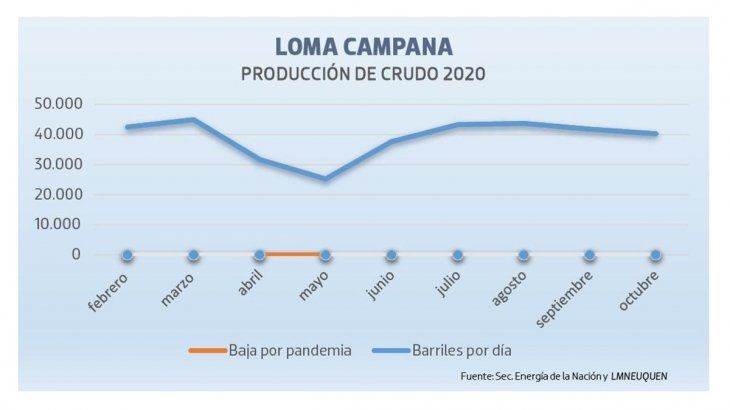 A pesar de ese escenario en pandemia, que después recuperó los niveles en julio y agosto, el crecimiento de la producción en Loma Campana fue de un 10,5% de marzo de 2019 (40.656 bdp) a marzo de 2020 (44.946), que fue el mes de mejor producción de crudo hasta el momento.