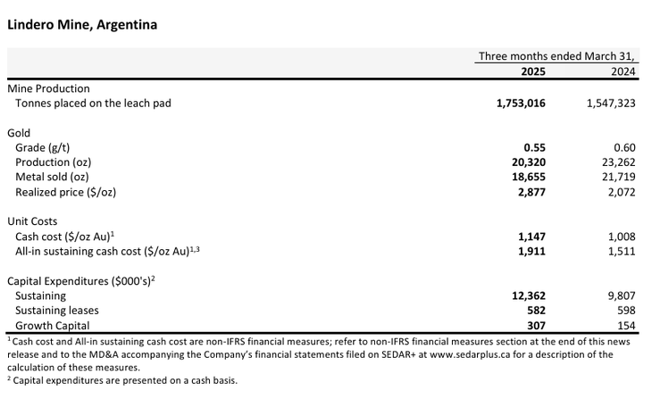 Durante el primer trimestre de 2025, la mina Lindero colocó 1.753.016 toneladas de mineral en la plataforma de lixiviación, con una ley promedio de oro de 0,55 g/t. La producción de oro de la mina fue de 20.320 onzas, lo que representa una disminución del 13% en comparación con el primer trimestre de 2024. Esta reducción se atribuye principalmente a menores leyes y al cronograma de la cinética de lixiviación.