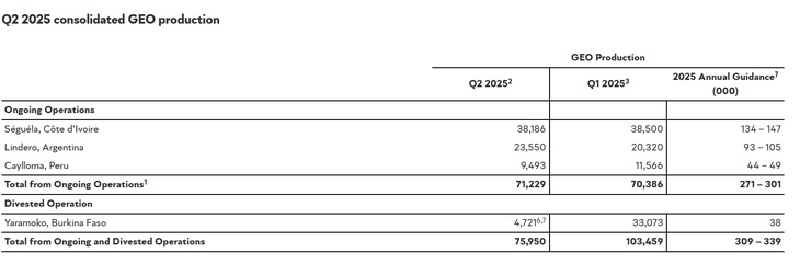 A nivel global, la firma anunció una producción consolidada de 71.229 onzas equivalentes de oro (GEO) entre abril y junio de este año, una cifra que mantiene su pulso frente al mismo trimestre de 2024, cuando registró 71.368 onzas.
