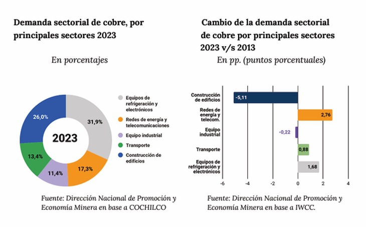 Este aumento en la demanda no será homogéneo. El informe proyecta una redistribución en los usos del cobre, con un notable crecimiento en el segmento de tecnologías verdes. Mientras que en 2023 los usos no verdes representaban el 75.4% de la demanda total, se espera que para 2050 esta cifra se reduzca a 55.8%.
