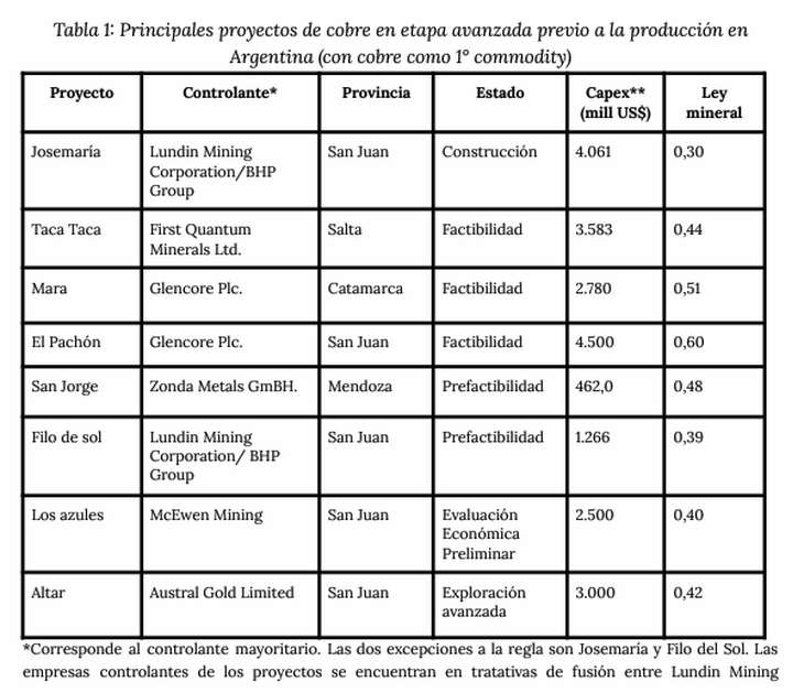 Nuestro país cuenta con un conjunto de proyectos de cobre en etapas avanzadas previas al inicio de operaciones, con los cuales se espera retomar la producción de cobre a gran escala -actualmente Martín Bronce, localizada en la provincia de Jujuy, produce cobre a pequeña escala- desde el cierre de la mina Bajo de la Alumbrera en 2018, y permita al país convertirse en un actor relevante en el mercado mundial del metal, a medida que aprovecha su gran potencial geológico.