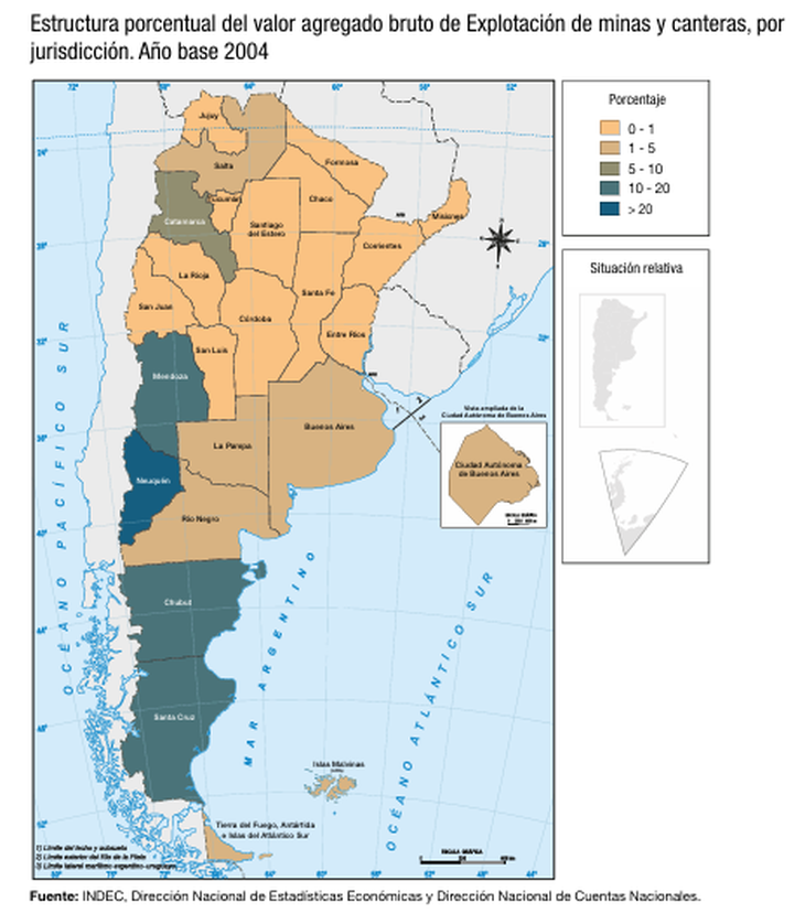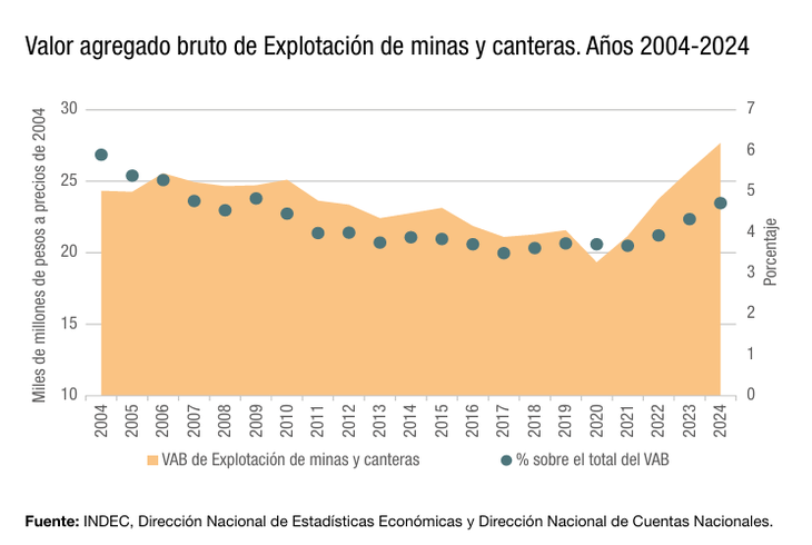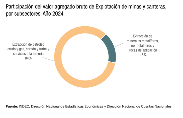 Según los datos presentados por el INDEC, en el año 2024, el Valor Agregado Bruto (VAB) de la explotación de minas y canteras mostró que la extracción de petróleo crudo y gas, carbón y turba, junto con los servicios a la minería, representaron el 84% del VAB total del sector. El 16% restante correspondió a la Extracción de minerales metalíferos, no metalíferos y rocas de aplicación.