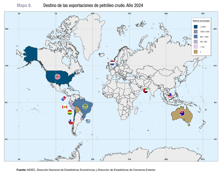 El informe también detalla el desempeño del comercio exterior del sector. Las exportaciones del complejo petrolero-petroquímico totalizaron cerca de 12.000 millones de dólares en 2024. La balanza comercial de este complejo registró un saldo positivo, superando los 6.000 millones de dólares en 2024.