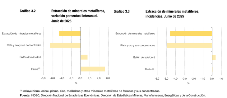 Esta baja fue impulsada principalmente por la subcategoría de "Plata y oro y sus concentrados", que retrocedió un 6,6% interanual. Aunque la extracción de "Bullón dorado/doré" mostró una leve recuperación del 1,5% en el mismo período, esta no fue suficiente para contrarrestar la tendencia negativa del sector.
