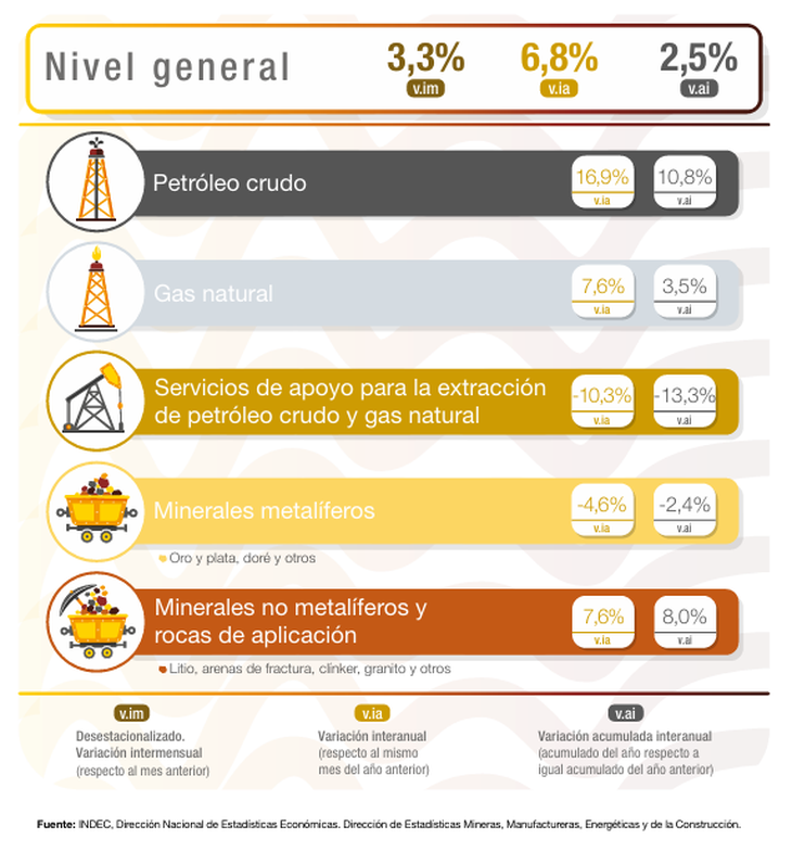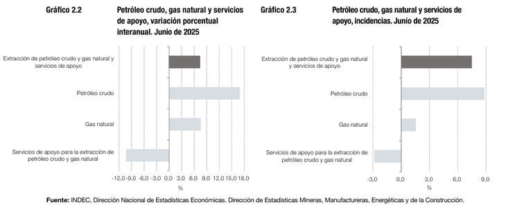 El principal impulsor de este crecimiento fue la "Extracción de petróleo crudo y gas natural y servicios de apoyo". En su conjunto, este segmento exhibió un robusto crecimiento del 7,5% en junio de 2025 en comparación con el mismo mes del año anterior. Esta cifra es aún más impresionante cuando se observa el desempeño acumulado, que registra una suba del 2,4% en el primer semestre.