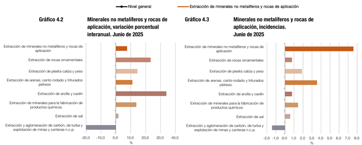 No obstante, la parte más preocupante del informe se encuentra en el sector de "Extracción de minerales metalíferos". A pesar del crecimiento general de la minería, esta rama experimentó una contracción, con una caída del 4,6% en junio de 2025 con respecto al año anterior y una disminución acumulada del 2,4% en el primer semestre.