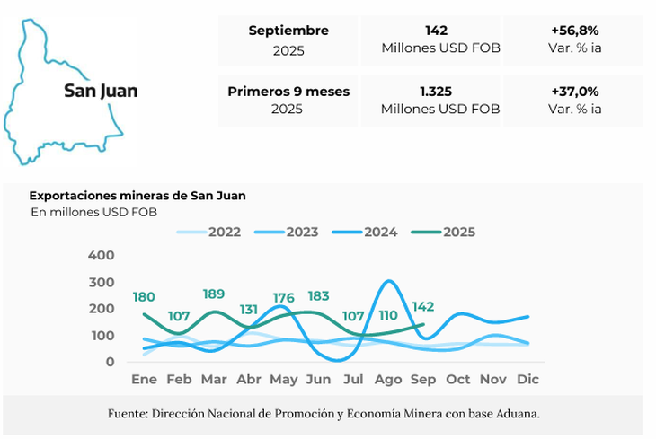 En septiembre, las exportaciones mineras de San Juan alcanzaron los USD 142 millones, mostrando un crecimiento del 56,8% respecto al mismo mes de 2024. Durante los primeros 9 meses del año, la minería representó el 85,3% de las exportaciones totales de la provincia.