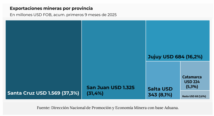 Santa Cruz se posiciona como la principal provincia exportadora de minerales. En los primeros 9 meses de 2025, la provincia sumó USD 1.569 millones, lo que representa el 37,3% del total nacional. La provincia registra un crecimiento interanual del 27,0% respecto al mismo periodo de 2024.