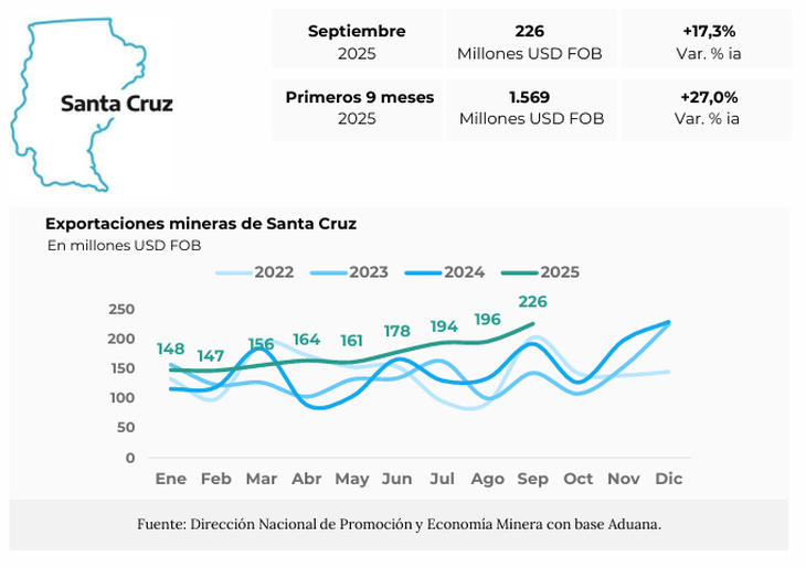 En septiembre de 2025, las exportaciones mineras de Santa Cruz alcanzaron los USD 226 millones, un incremento del 17,3% respecto a septiembre de 2024. Este valor marca el nivel más alto que registra la provincia para dicho mes. La actividad minera explicó el 84,4% de las exportaciones santacruceñas totales en el periodo analizado.