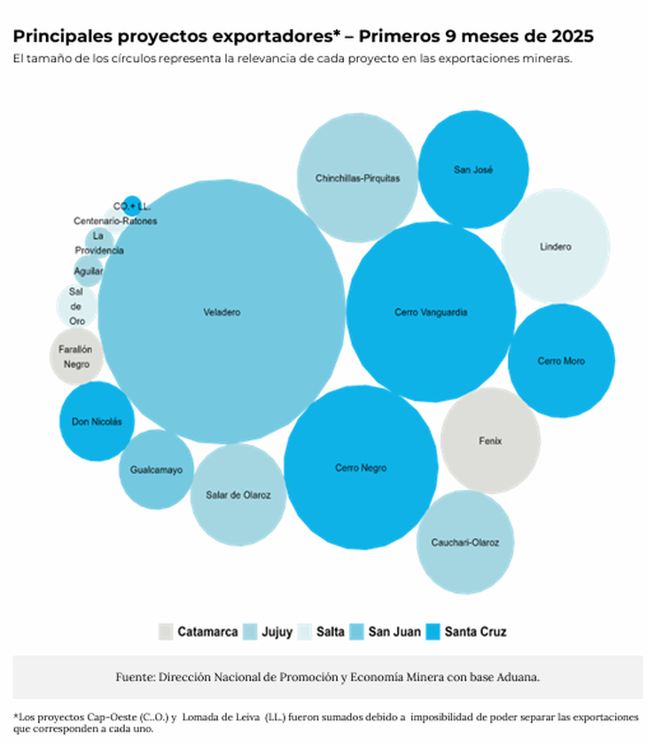 La minería consolida su rol estratégico en estas economías. En el acumulado enero-septiembre, la actividad explicó el 79,3% de las exportaciones totales de estas cinco provincias. La incidencia es notablemente alta en: Catamarca (92,1%), San Juan (85,3%), Santa Cruz (84,4%), Jujuy (80,4%) y Salta (47,5%).