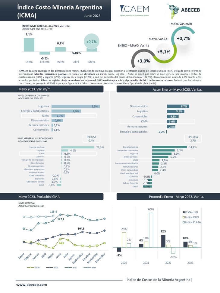 “La medición de mayo muestra que los costos en dólares del sector minero metalífero acumulan en los primeros cinco meses de 2023 una suba del 3%, siendo en mayo 0,3 puntos porcentuales (pp) superior a la inflación núcleo de Estados Unidos (0,4%) utilizada como referencia internacional”, detallan desde la CAEM.