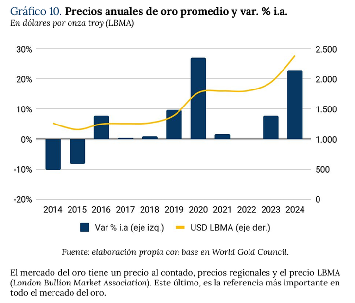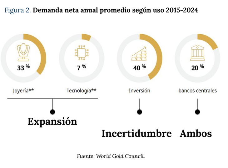 De acuerdo al informe “Mercado de oro activo de inversión estratégico. Panorama mundial y local”, elaborado por la secretaria de Minería, el rendimiento del oro refleja sus diversas fuentes de demanda, que incluyen la inversión, su uso como activo de reserva de valor, la joyería y la tecnología.
