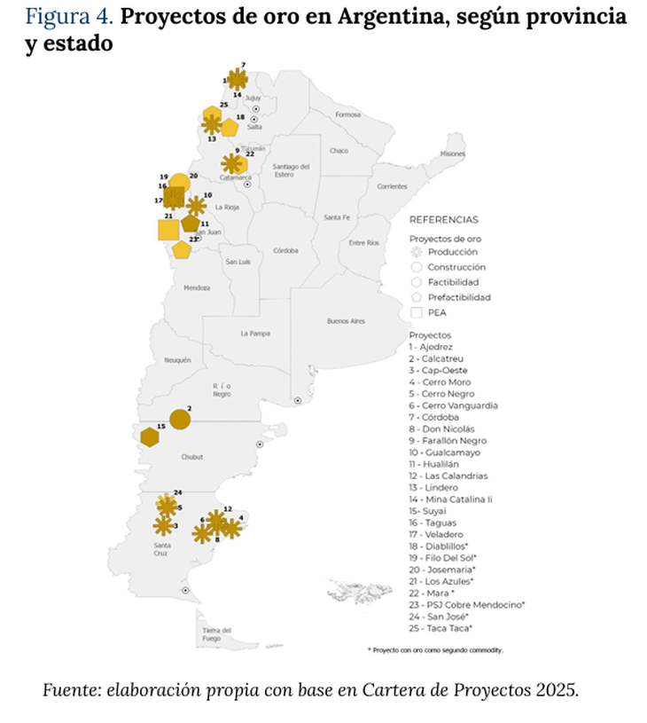 Las principales productoras mundiales con presencia en Argentina incluyen Barrick Mining Corp., Newmont Corp., AngloGold Ashanti plc. y Shandong Gold Mining Co. Ltd.. En las etapas avanzadas, el Proyecto Calcatreu (Río Negro), de Patagonia Gold, recibió la aprobación final para iniciar la construcción. Este proyecto reporta recursos medidos e indicados de 9,84 millones de toneladas con una ley promedio de 2,11 g/t de oro.