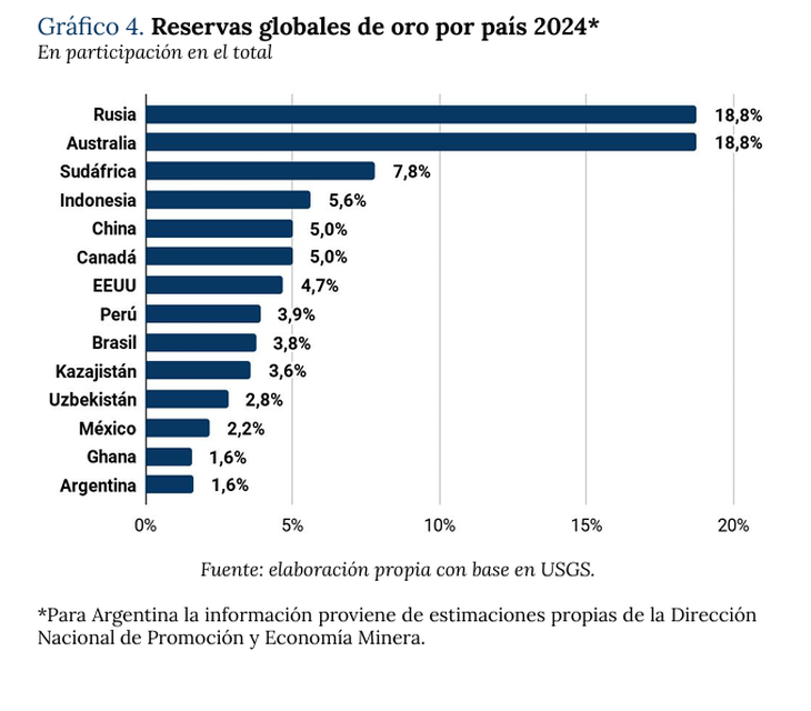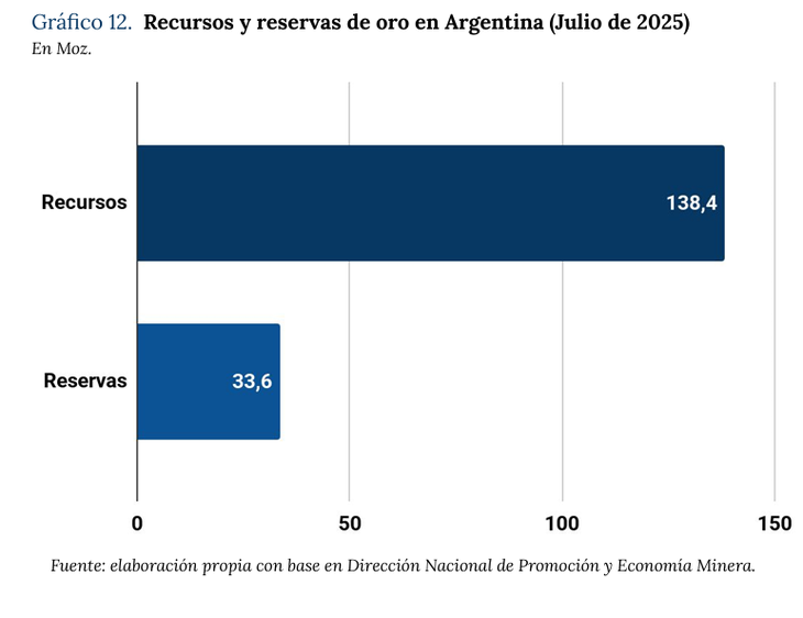 Nuestro país presenta un significativo potencial aurífero, demostrado en sus volúmenes de recursos y reservas. Los recursos de oro en territorio argentino ascienden a 138,4 Moz., mientras que las reservas se contabilizan en 33,6 Moz.. Argentina explica el 1,6% de las reservas globales de oro de 2024.