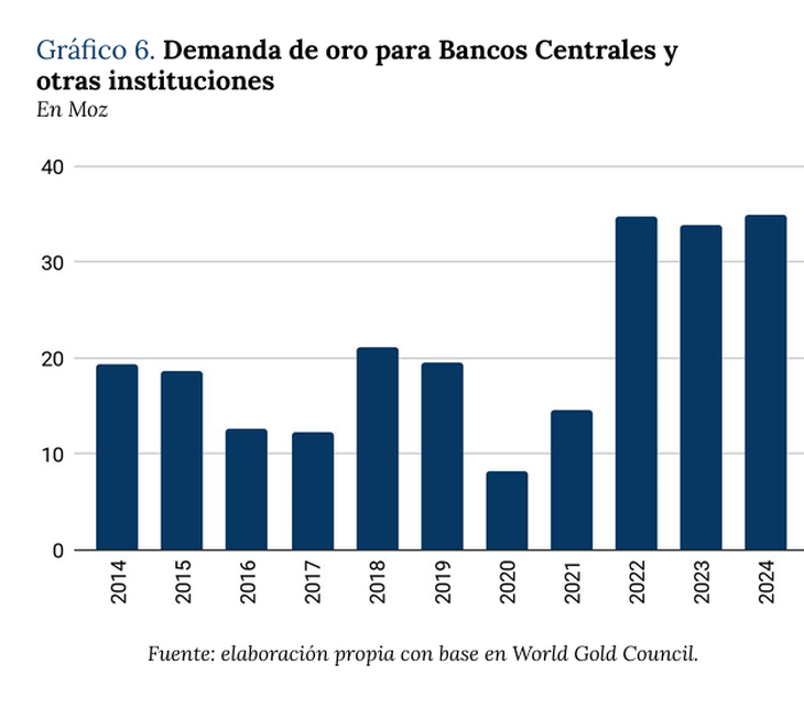 Los Bancos Centrales son compradores esenciales, acumulando aproximadamente una quinta parte de todo el oro extraído históricamente. La acumulación de oro por parte de los BC se acelera en los últimos tres años, superando las 1.000 Tn. en 2024. El oro es un componente clave de las reservas porque aporta seguridad, liquidez y rentabilidad. El aumento de las compras de oro por parte de los BC representa una alternativa de cobertura contra la inflación y la devaluación de monedas. Además, economías en desarrollo, como China y Rusia, buscan menor dependencia frente a monedas fuertes y obtienen un seguro contra sanciones y confiscaciones de activos.