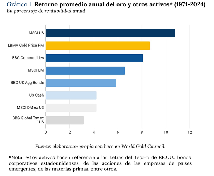 Desde 1971, el retorno del oro resulta similar al de las acciones y supera consistentemente al de los bonos. En el transcurso de las últimas dos décadas, el oro sobrepasó la mayoría de las principales clases de activos de relevancia en el mercado. Por ejemplo, en los últimos 10 años, el metal superó el rendimiento anualizado de los bonos del tesoro de EE. UU. (US treasury), el índice de rendimiento de los commodities (BBG Commodities) y el rendimiento total bruto de mercados emergentes (MSCI EM).