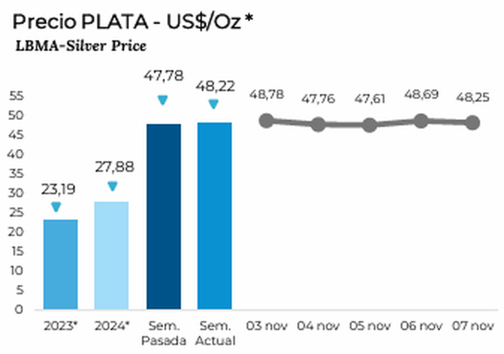 La plata cierra en US$48,25 por onza, un 1,01% por debajo del valor semanal anterior. Además del dólar firme y la distensión geopolítica, las expectativas de menores recortes de tasas de interés reducen su atractivo frente a activos con rendimiento. "La relación oro/plata alcanzó los 82,43, un 0,30% por arriba del valor de la semana pasada, lo que indica una apreciación relativa del oro frente a la plata", afirma el reporte.