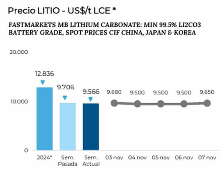 El carbonato de litio grado batería (spot CIF China, Japón y Corea) termina en US$9.650 por tonelada, con una merma del 0,31%. Especulaciones sobre la reactivación de operaciones en minas de Yichun (China) generan temores de sobreoferta. "Esta disminución moderada en el precio fue impulsada por factores especulativos de oferta, sobre todo respecto a una reactivación anticipada de operaciones en algunas minas de la región Yichun (China), generando temores respecto a un aumento de la oferta", explica el informe.