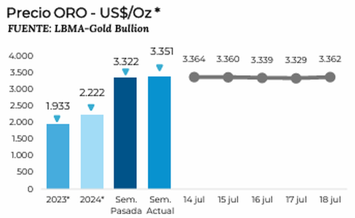 El precio del oro cerró la semana en US$3.361,8 por onza, registrando una variación negativa de 0,14% respecto al viernes pasado.