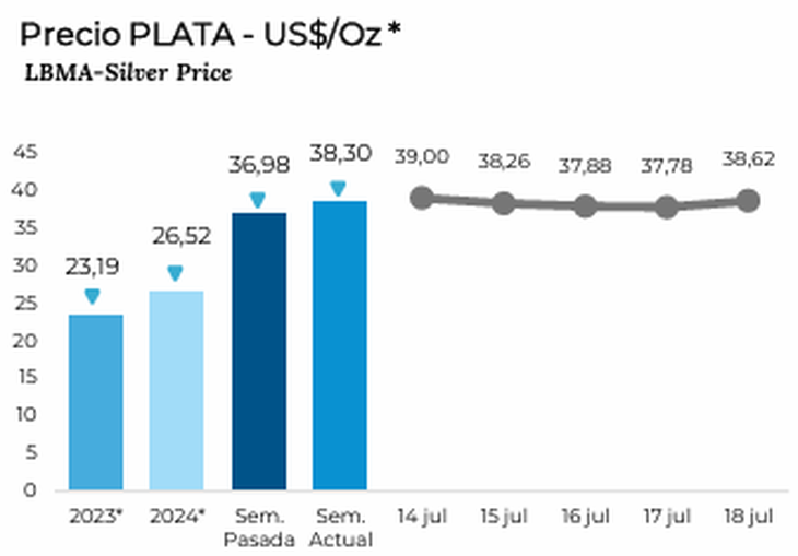 El precio de la plata continúa al alza, alcanzando los US $38,62 la onza, lo que representa un aumento del 0,36% en comparación con el pasado viernes.