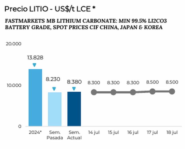 Por su parte, el hidróxido de litio concluyó la semana en US$ 8.000 la tonelada, manteniendo la misma cotización del viernes pasado.